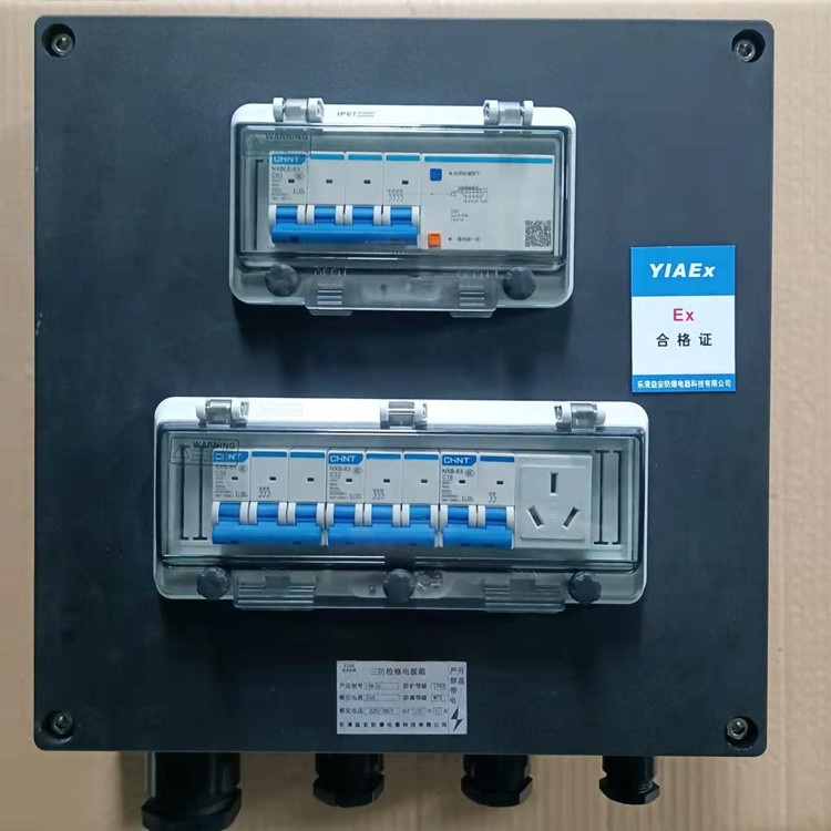 三防配電箱正泰元件,總開關帶漏電保護,三個分開關帶一個導軌式插座,壁掛式安裝,三防箱采用工程塑料壓鑄而成,表面為黑色,下進下出,外殼尺寸為360*360*120,可在戶內戶外使用,優質緊固件,可根據客戶要求定制斷路器電流大小和級數。